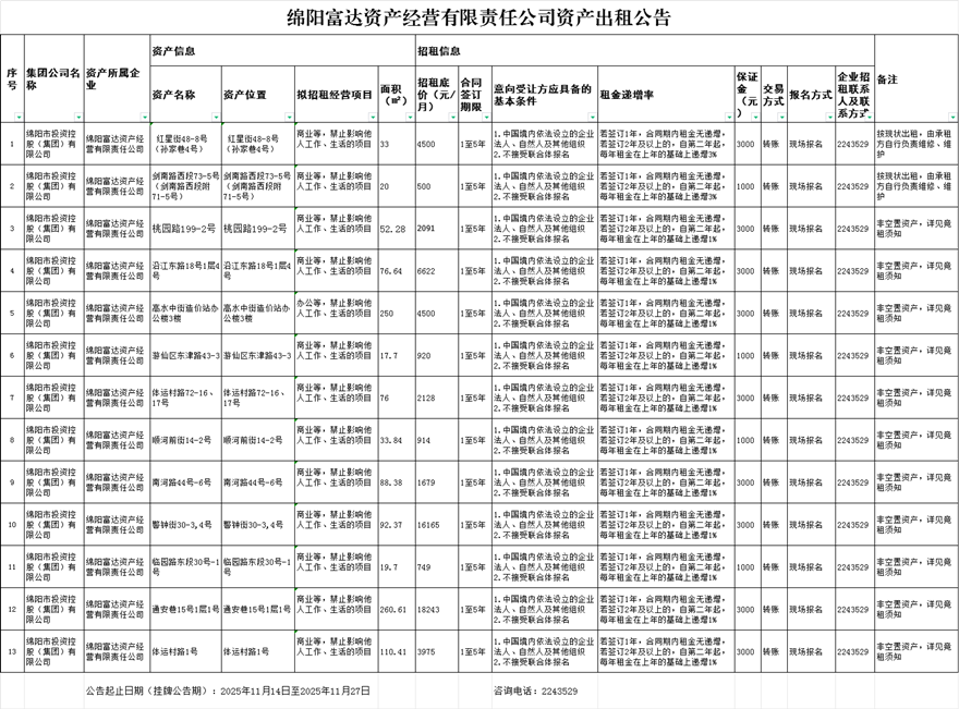 綿陽富達(dá)資產(chǎn)經(jīng)營(yíng)有限責(zé)任公司資產(chǎn)出租公告