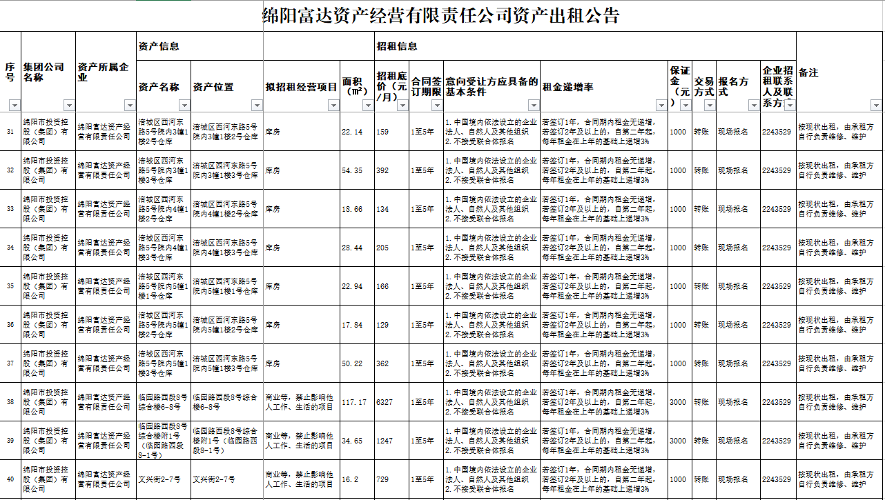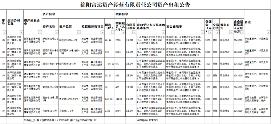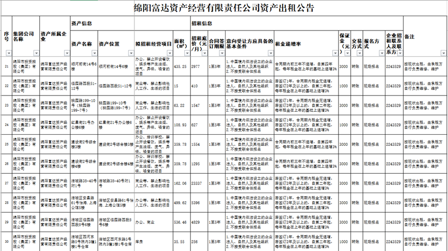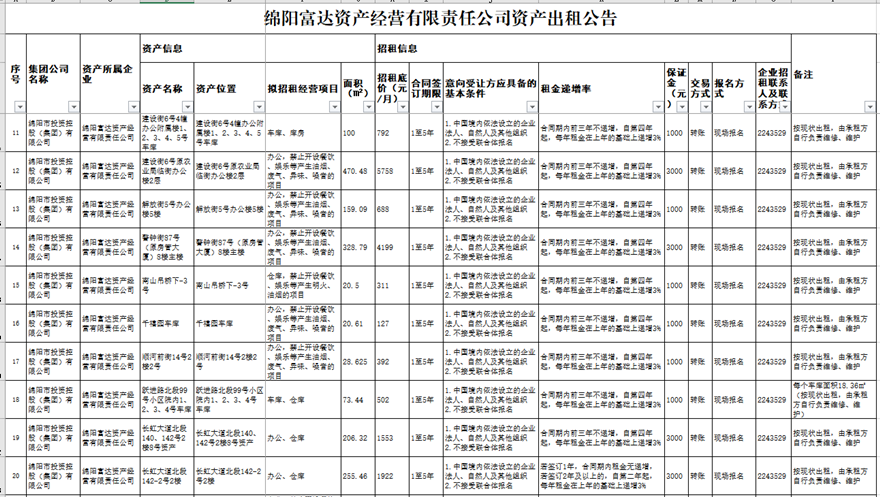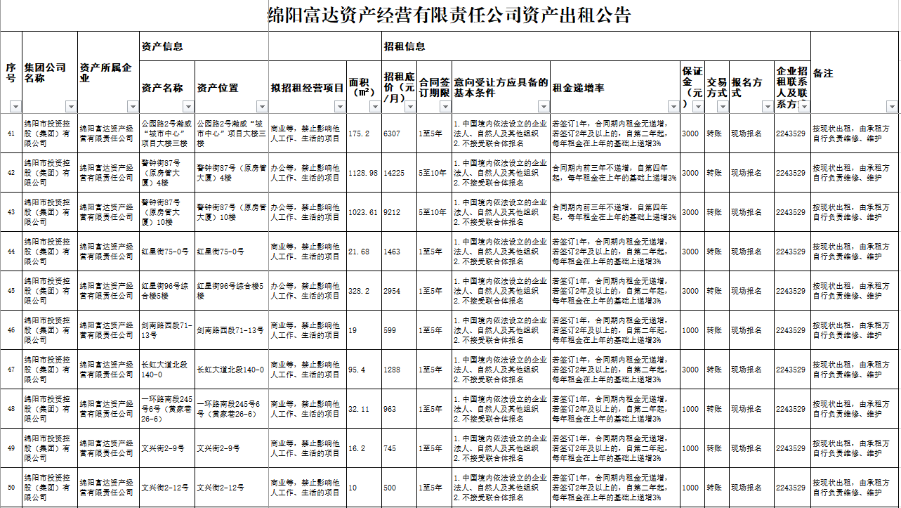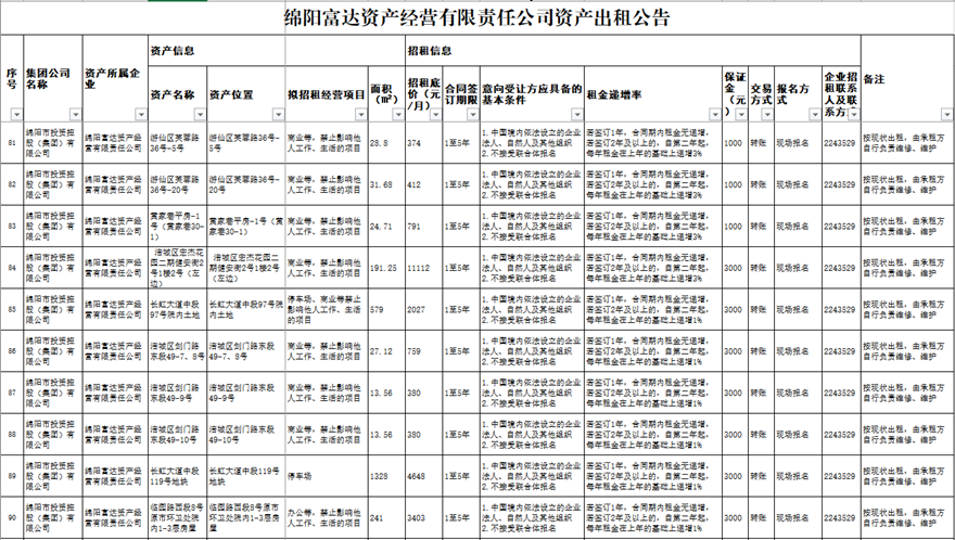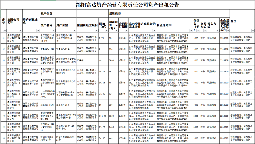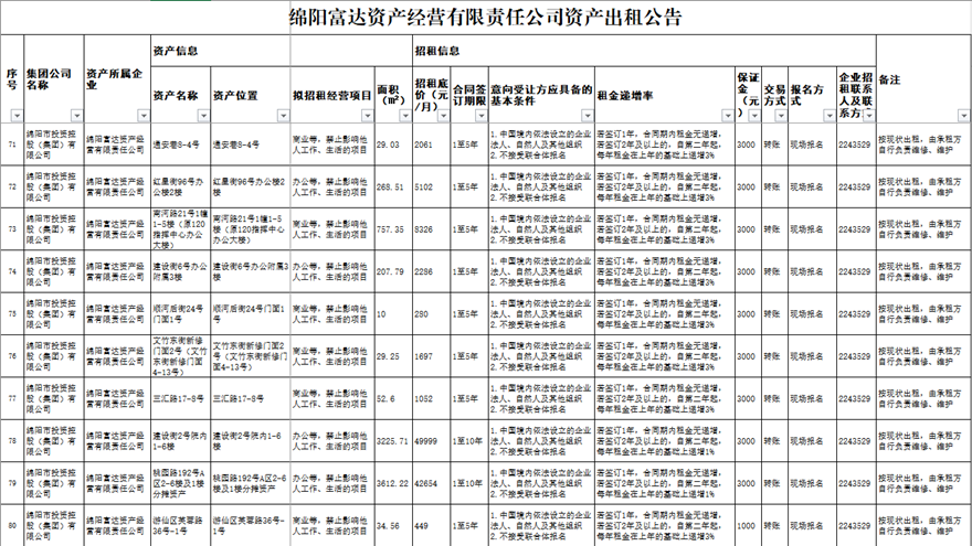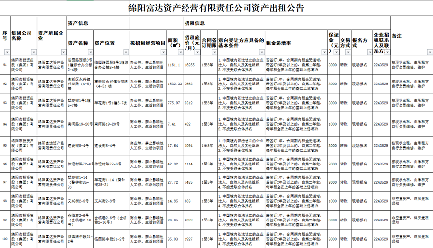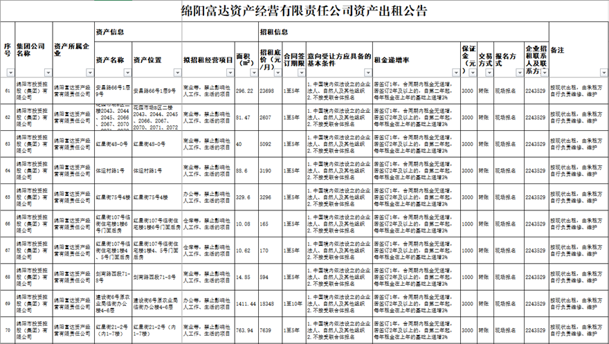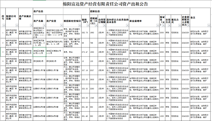綿陽富達資產經營有限責任公司資產出租公告