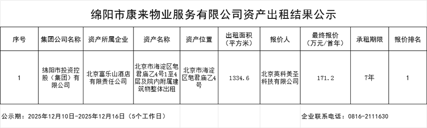 綿陽市康來物業(yè)服務有限公司資產出租結果公示
