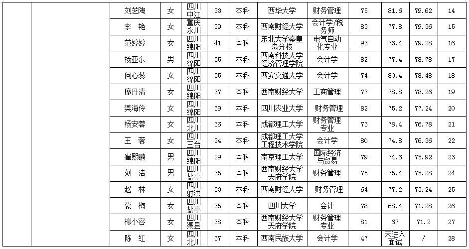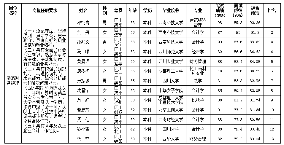 根據(jù)綿陽市投資控股(集團)有限公司發(fā)布的招聘公告及招聘相關規(guī)定,經(jīng)筆試、面試等程序,現(xiàn)將筆試(面試)成績予以公示。
