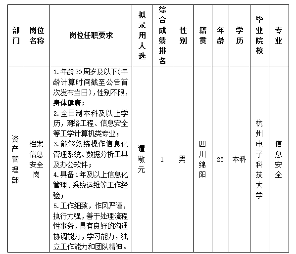 根據綿陽市綿投商業(yè)運營管理有限責任公司發(fā)布的招聘公告及招聘相關規(guī)定,經筆試、面試、背景調查、體檢等程序,擬錄用譚敬元同志到綿陽市綿投商業(yè)運營管理有限責任公司工作,現(xiàn)予以公示,具體情況如下: