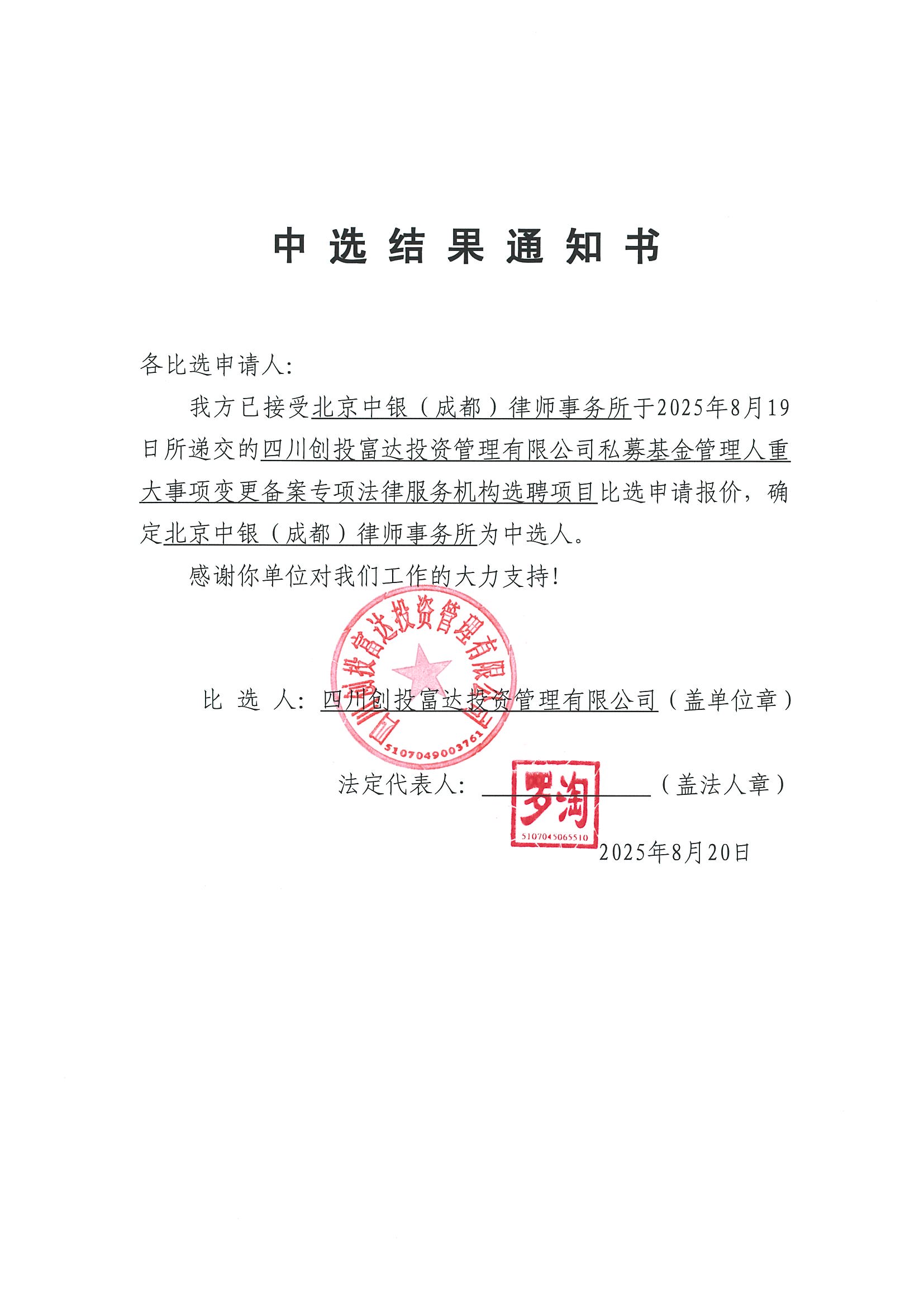創(chuàng)投富達(dá)私募基金管理人重大事項(xiàng)變更備案專項(xiàng)法律服務(wù)機(jī)構(gòu)選聘中選結(jié)果通知